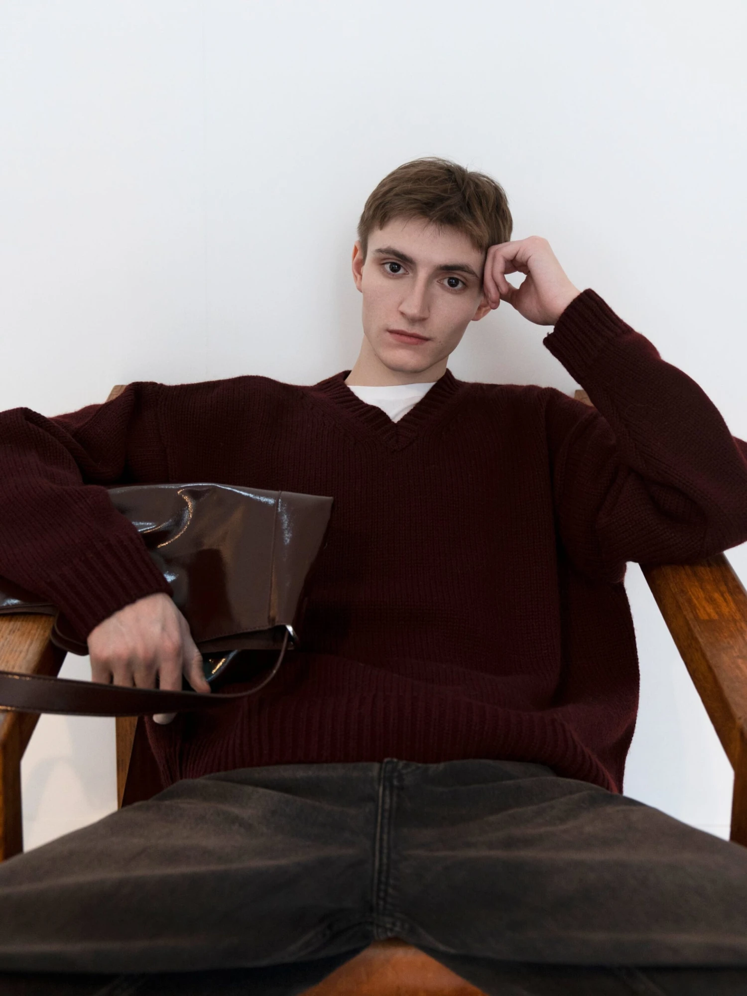 A heavyweight wool-cashmere knit with a subtle V-neck. Designed with an easy, slightly oversized fit in a rich burgundy hue.