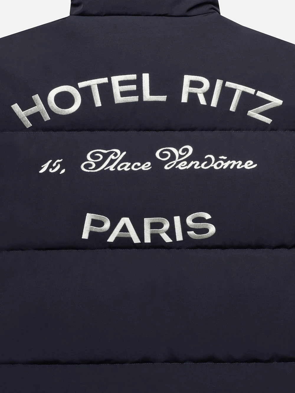 Cropped for a fit that works with wide-legs and winter sportswear, zip up the neck on this abundantly warm Navy puffer to keep out harsh city winds—then wear it open for aprés hour. Crafted from cotton and recycled polyester and finished with functional drawstring cords and the FRAME and Ritz Paris logos in contrasting white.