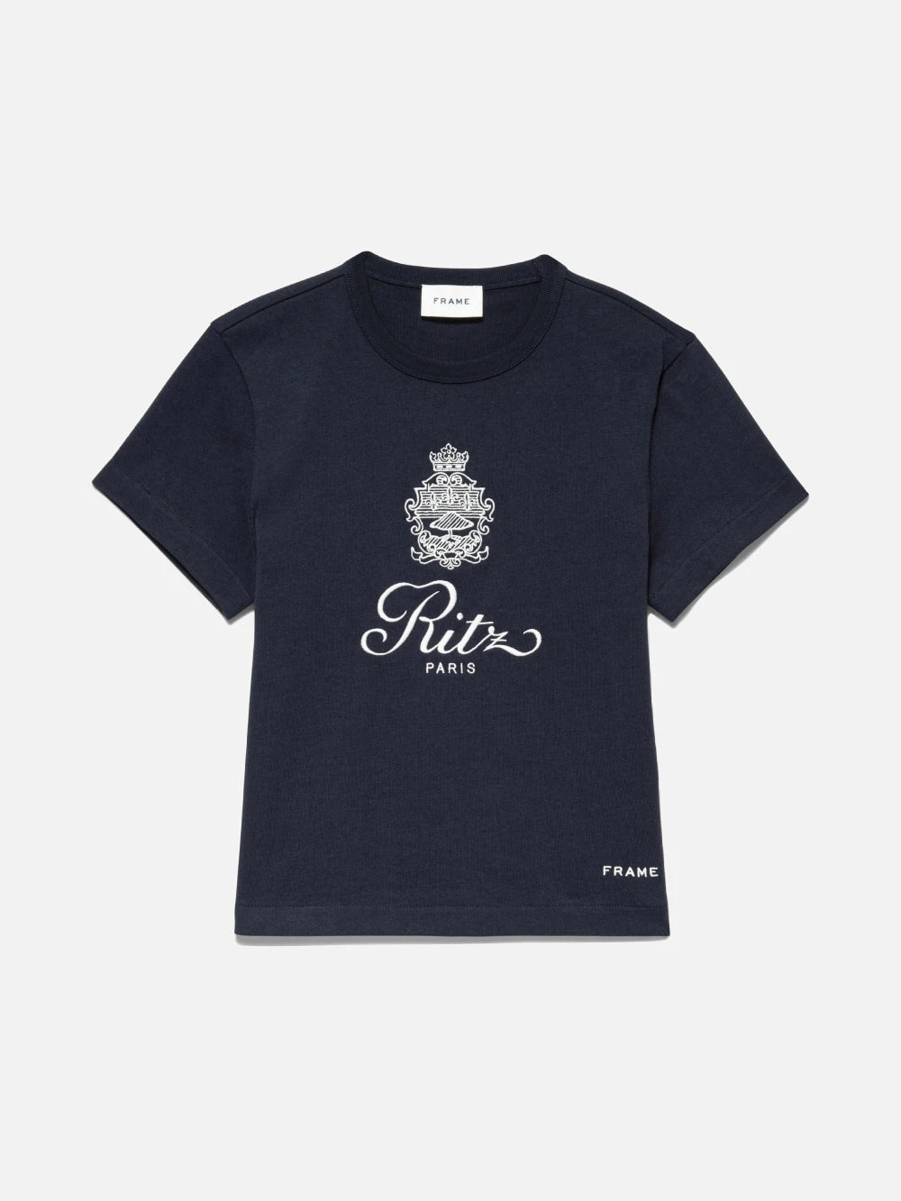 A Ritz Paris x FRAME capsule collection essential for tucking into denim flares on days off, layering under a blazer at the office, and pairing with cutoffs at the petanque court. This 100% cotton shrunken tee is cut for a slim, streamlined fit, and features the FRAME and Ritz Paris logos embroidered in contrasting white.