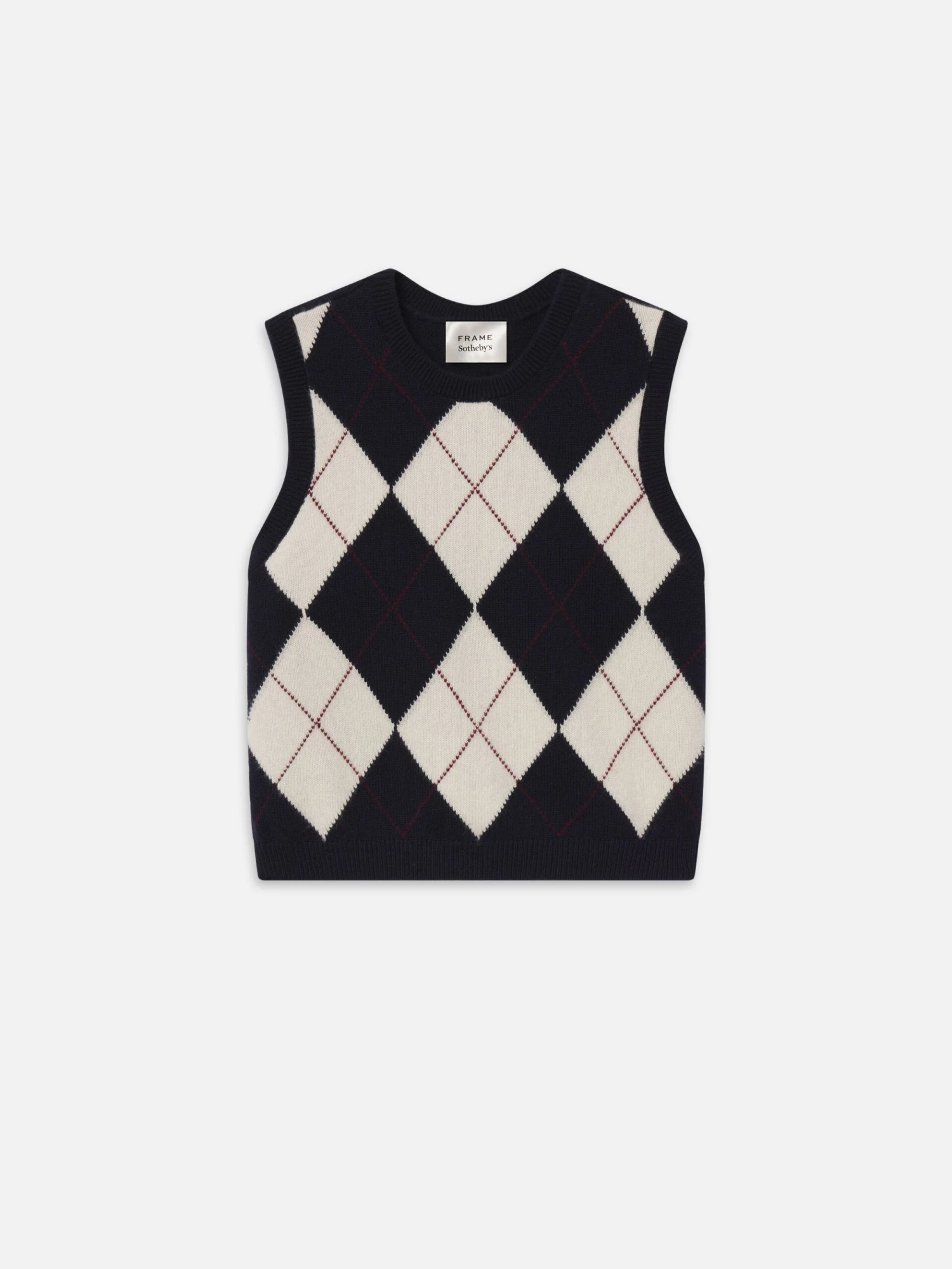 Soft, warm, and easy to wear, this argyle vest is knit from 100% cashmere in a cream and navy pattern with fine red detailing. Finished with ribbed trims, the sleeveless design layers effortlessly over shirting or stands alone as a chic knit.
