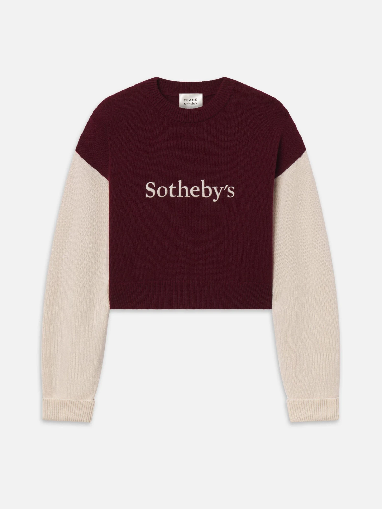 Soft and easy with a touch of nostalgia. This cropped cashmere sweater is knit in rich burgundy with cream sleeves and finished with ribbed trims and the Sotheby’s logo across the chest. An everyday luxury—just as good layered as it is worn on its own.