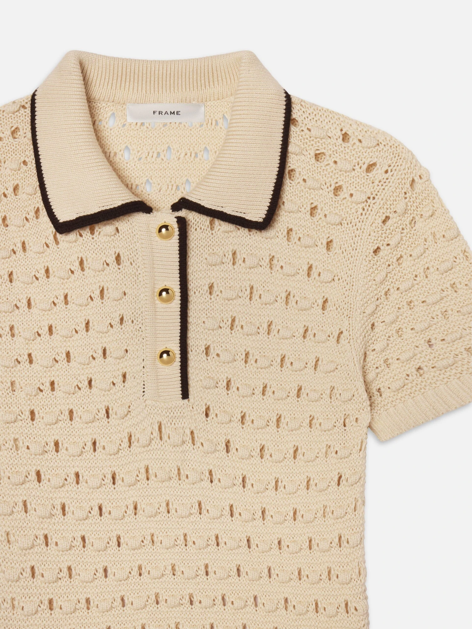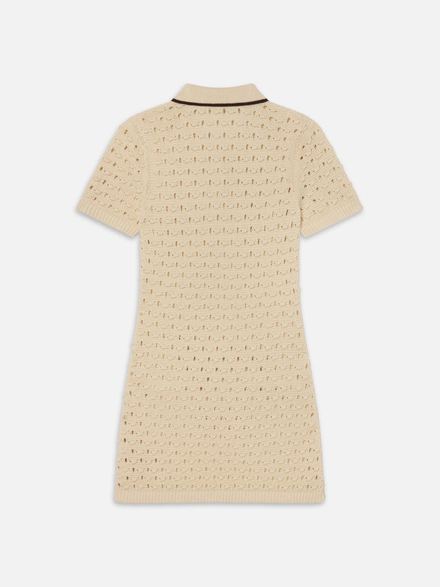 Our signature Bauble texture—lightweight, airy, and dimensional—features pointelle openwork that brings structure and shape to every summer look. Finished with gold summarys and black trim, this cream knit dress feels right at home from seaside lunches to city strolls.