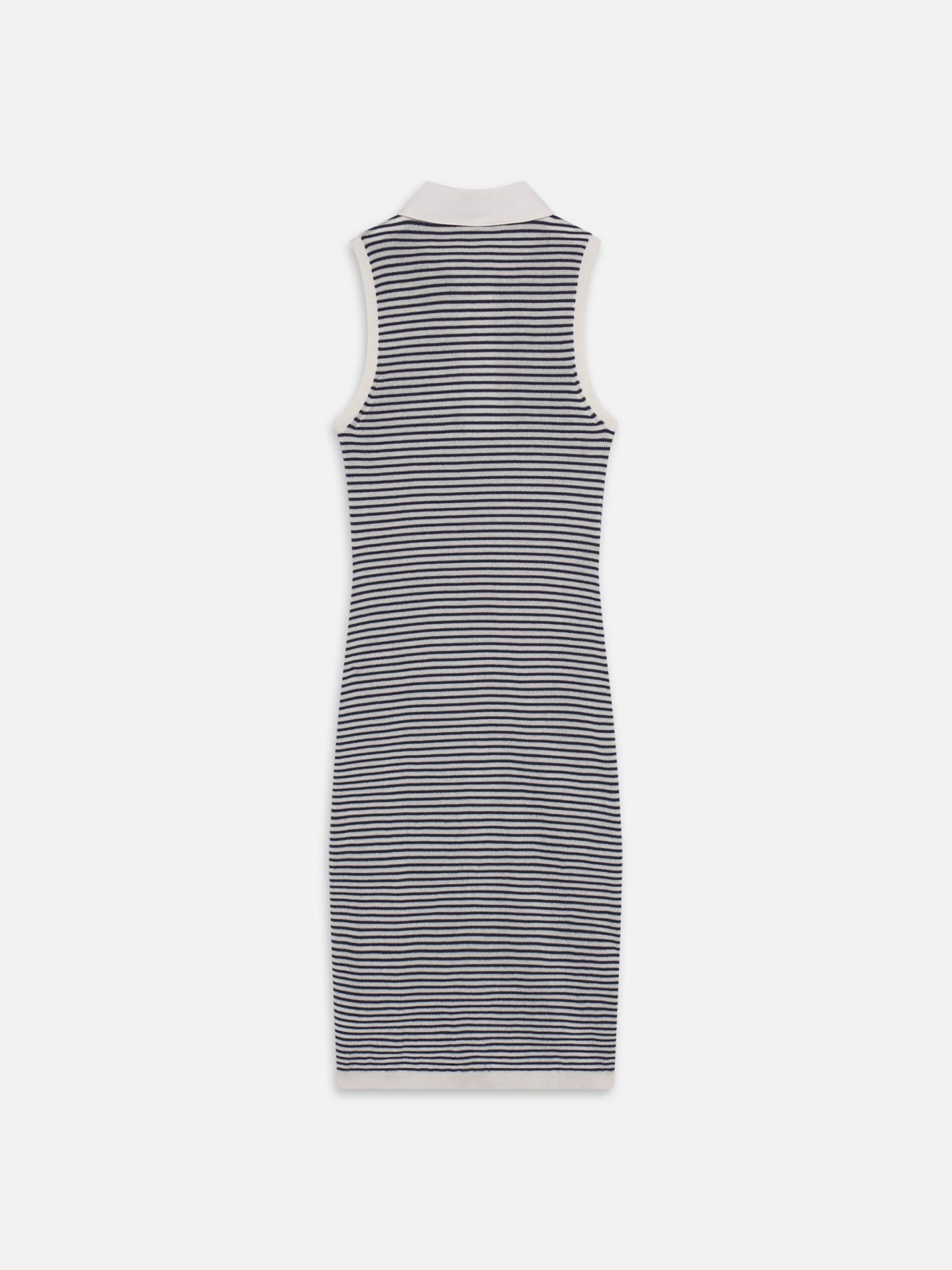 Crafted in cotton, cashmere, and linen, The Bold Stripe Dress is a triple threat. The sleeveless design features contrast fabric at the collar and summary placket, as well as a navy stripe motif—perfect for the coastal prep moment that’s taking over summer.