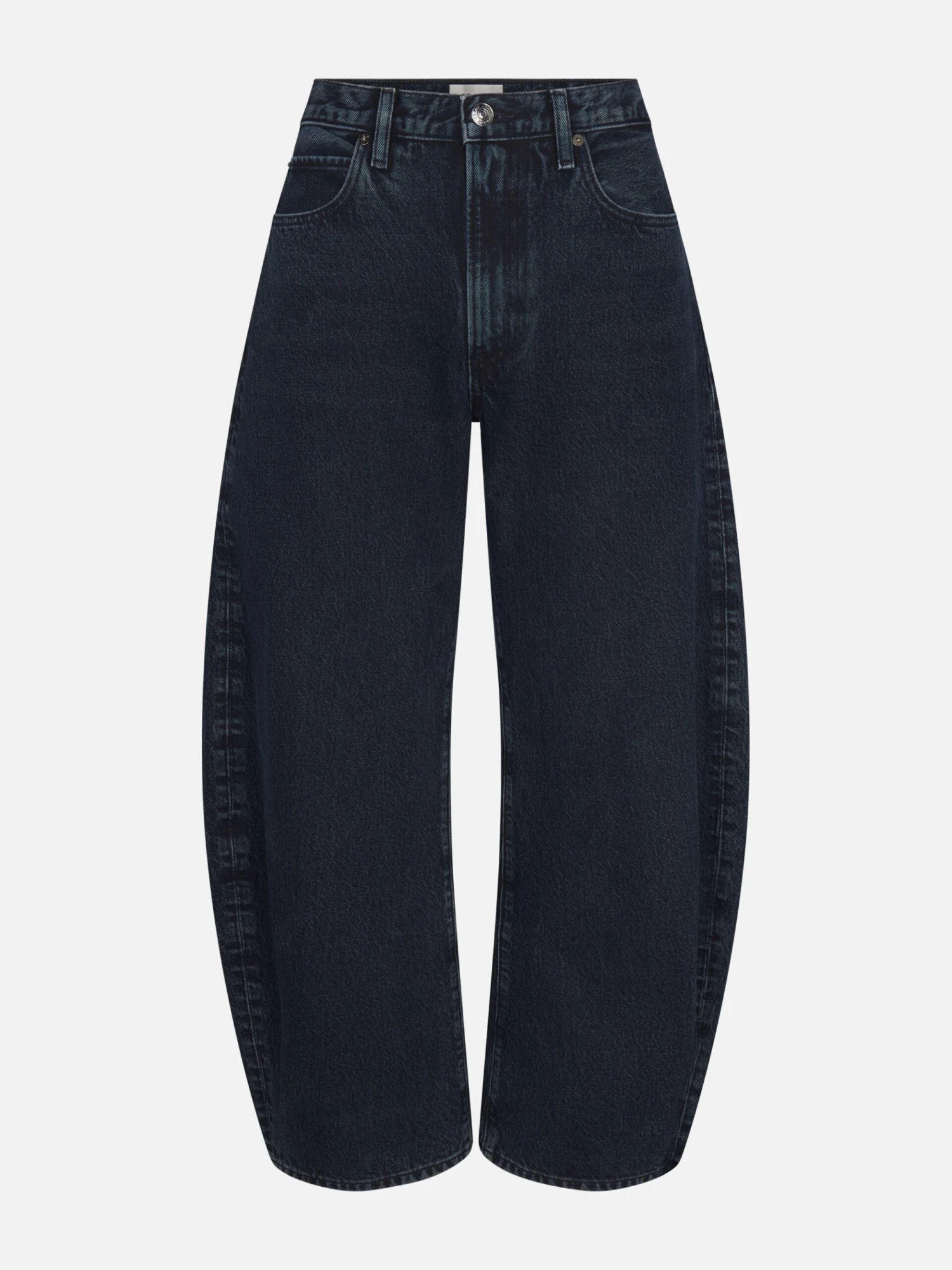 An exaggerated take on the trending barrel silhouette, this unique fit is your new closet necessity. With a flattering high rise, these jeans feature a curved outseam for a playful bubble effect. Designed to be worn cuffed and hit at the ankle, the 2.5″ twice-rolled cuff can be unrolled for a longer, more dramatic inseam.