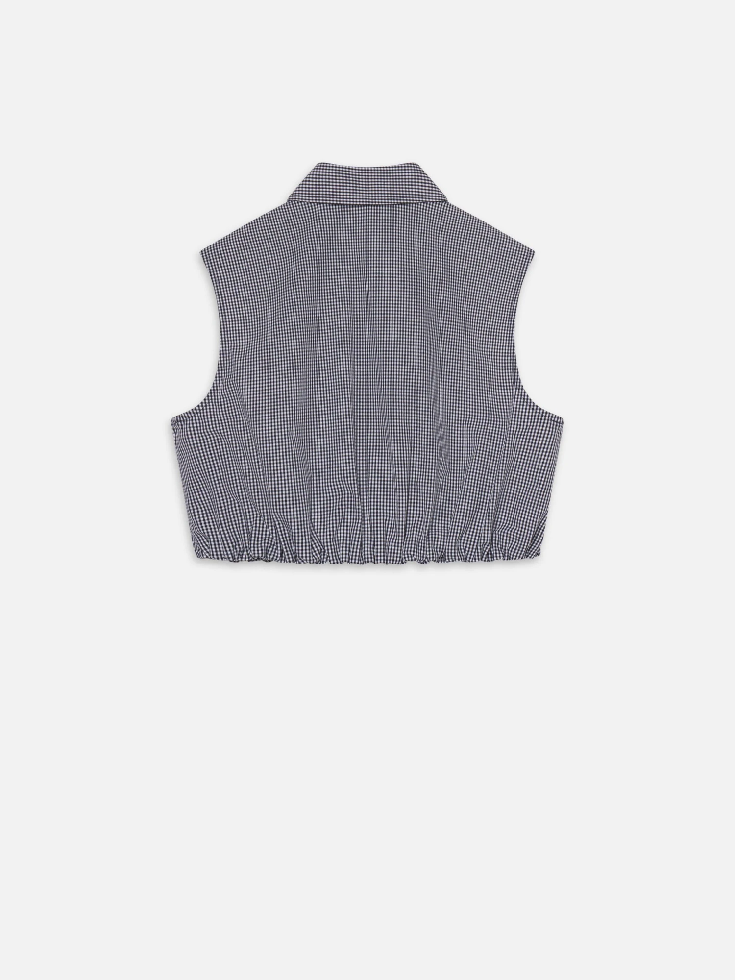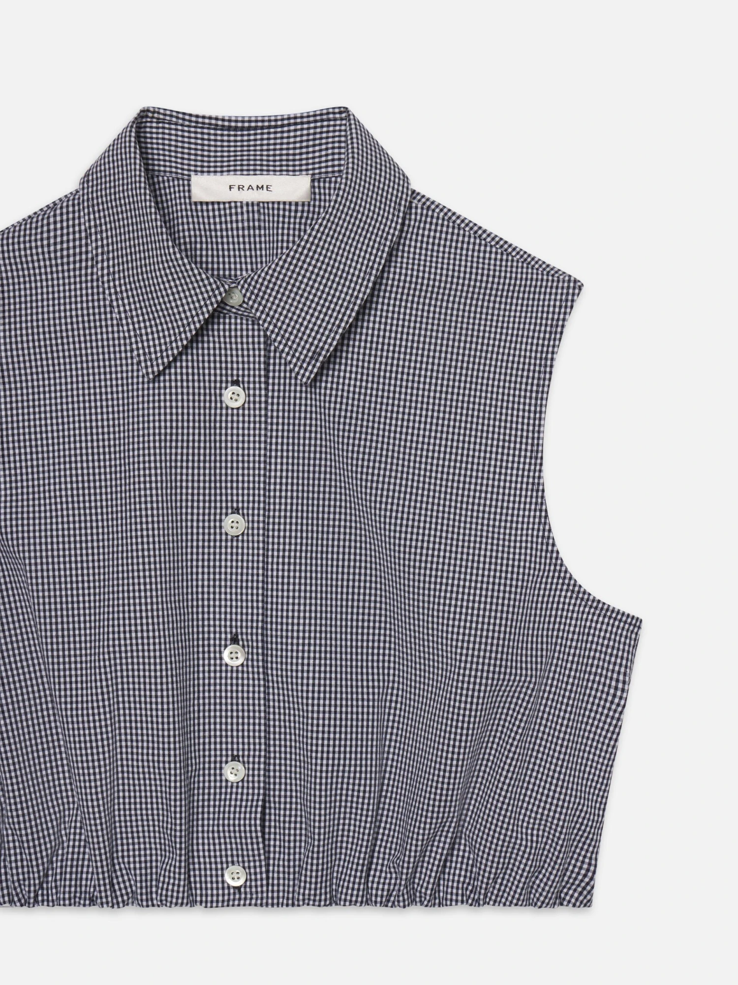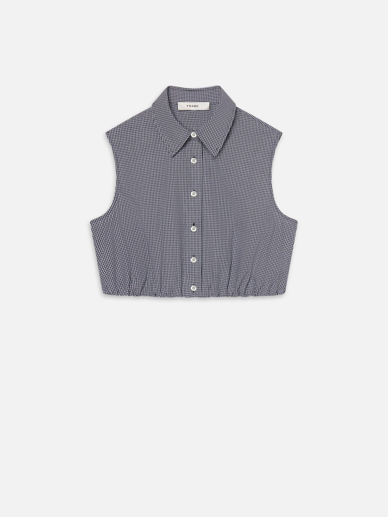 Check, please. This sleeveless, collared top is cropped at the waist with soft gathers at the elastic waist. Lightweight in pure cotton, this navy gingham is made for warm days—and even better with the matching skirt.