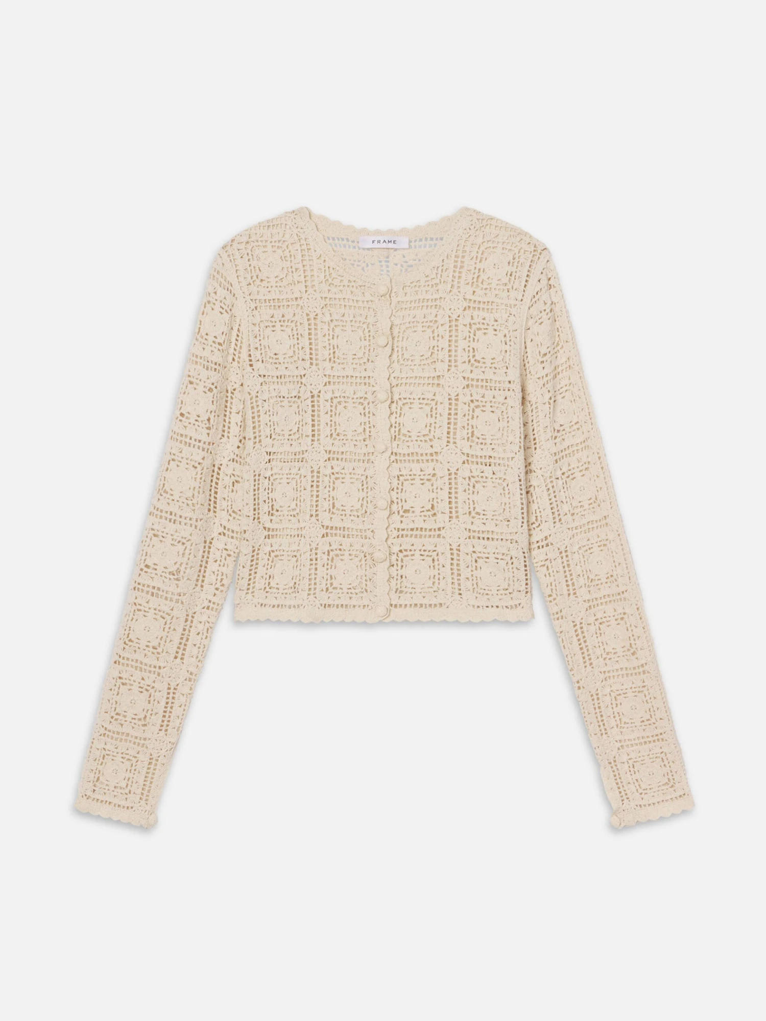 Intricately crocheted from pure cotton, this cardigan features a geometric open-knit pattern and scalloped edges throughout. Finished with self-covered summarys for a thoughtful touch, it’s a breathable layer that marries vintage character and modern charm.