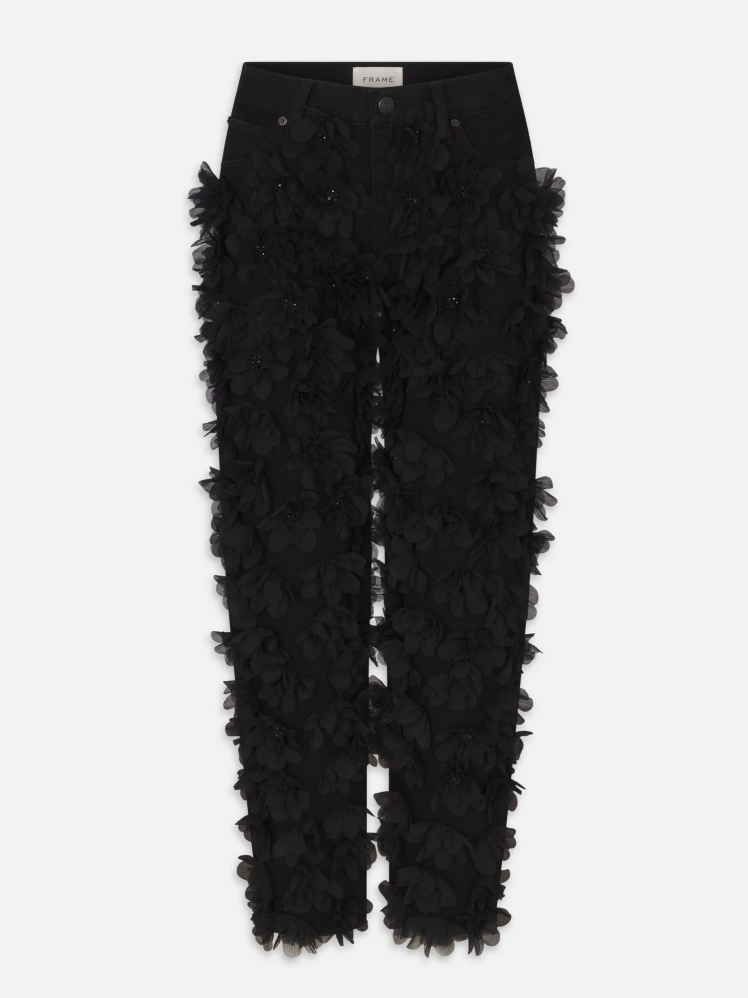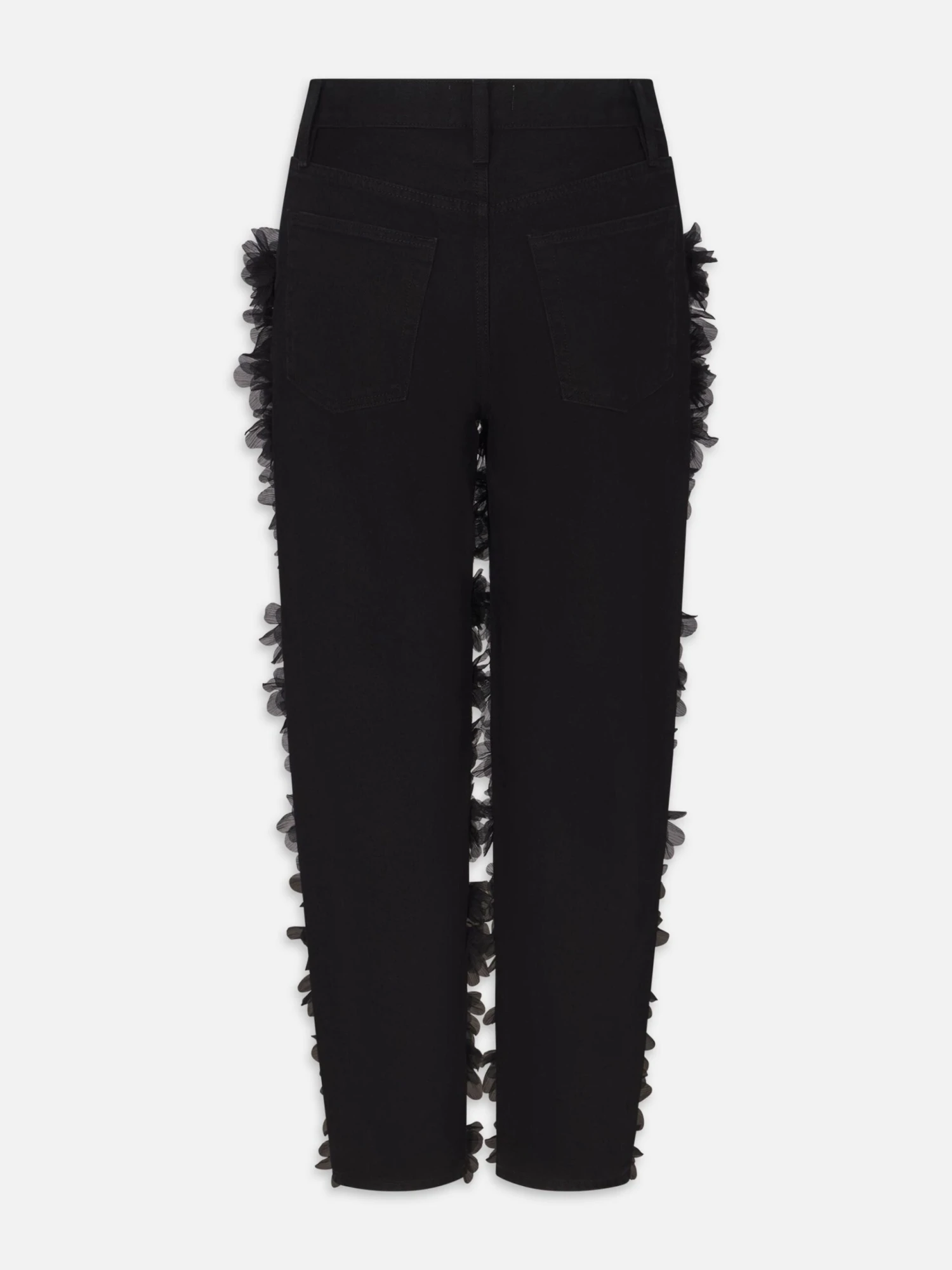 A luxe, textural addition to your denim rotation, this jean features fluffy light tulle down the front of the leg. A mid-rise, non-stretch jean with a delicately curved outseam that finishes at the ankle.
