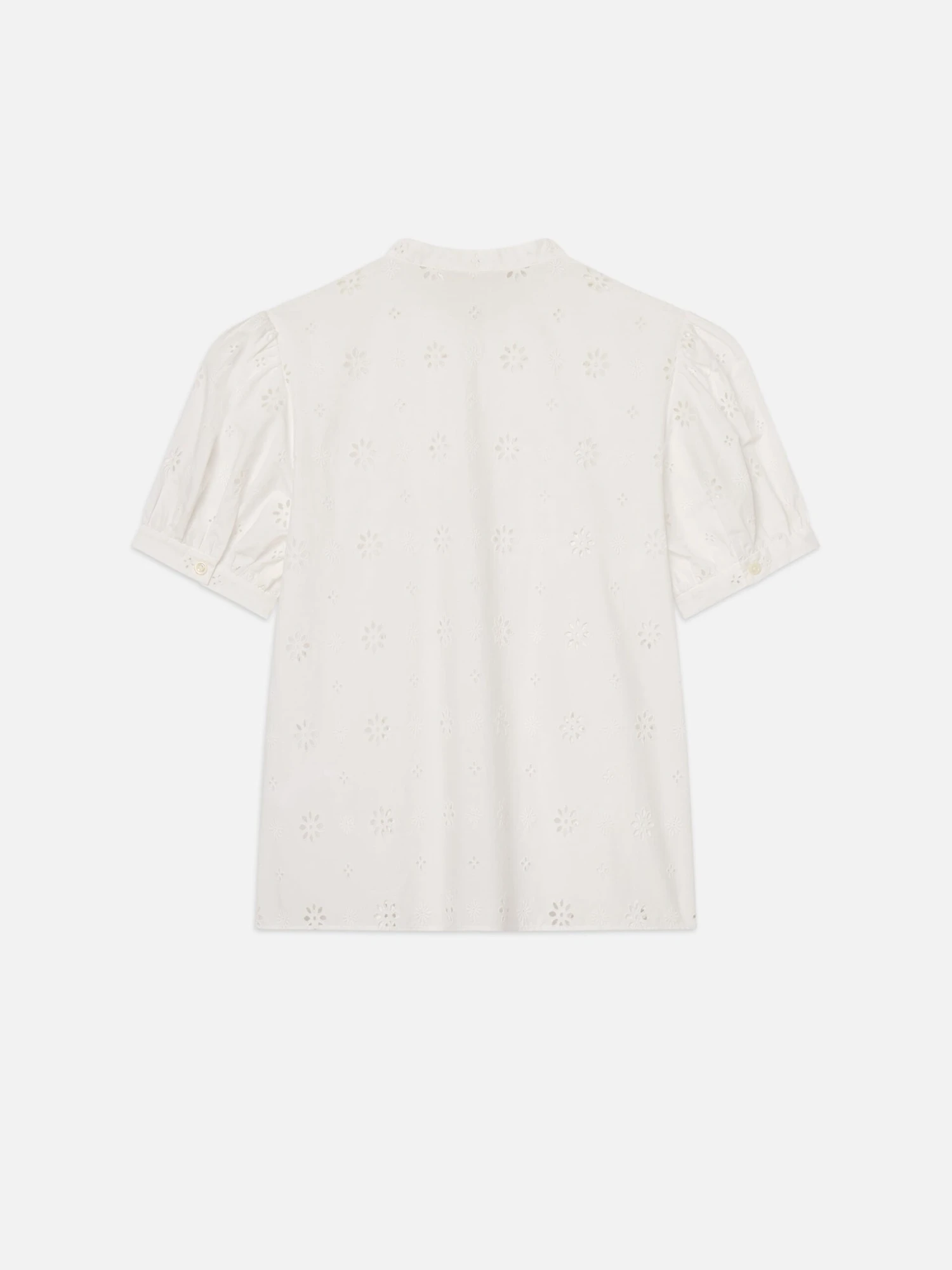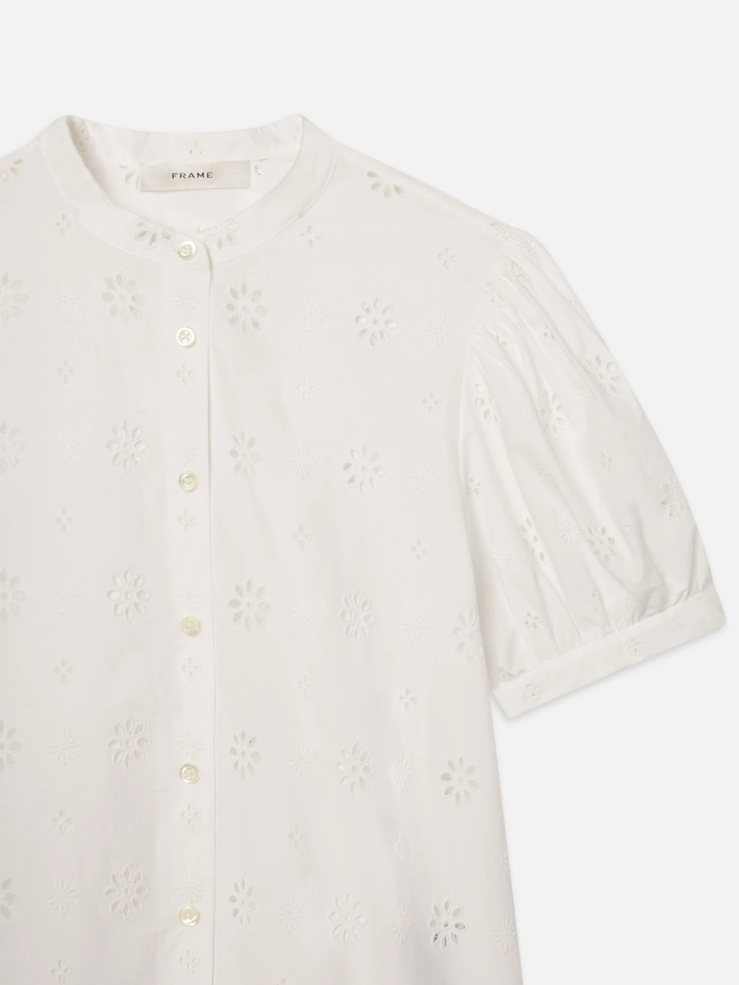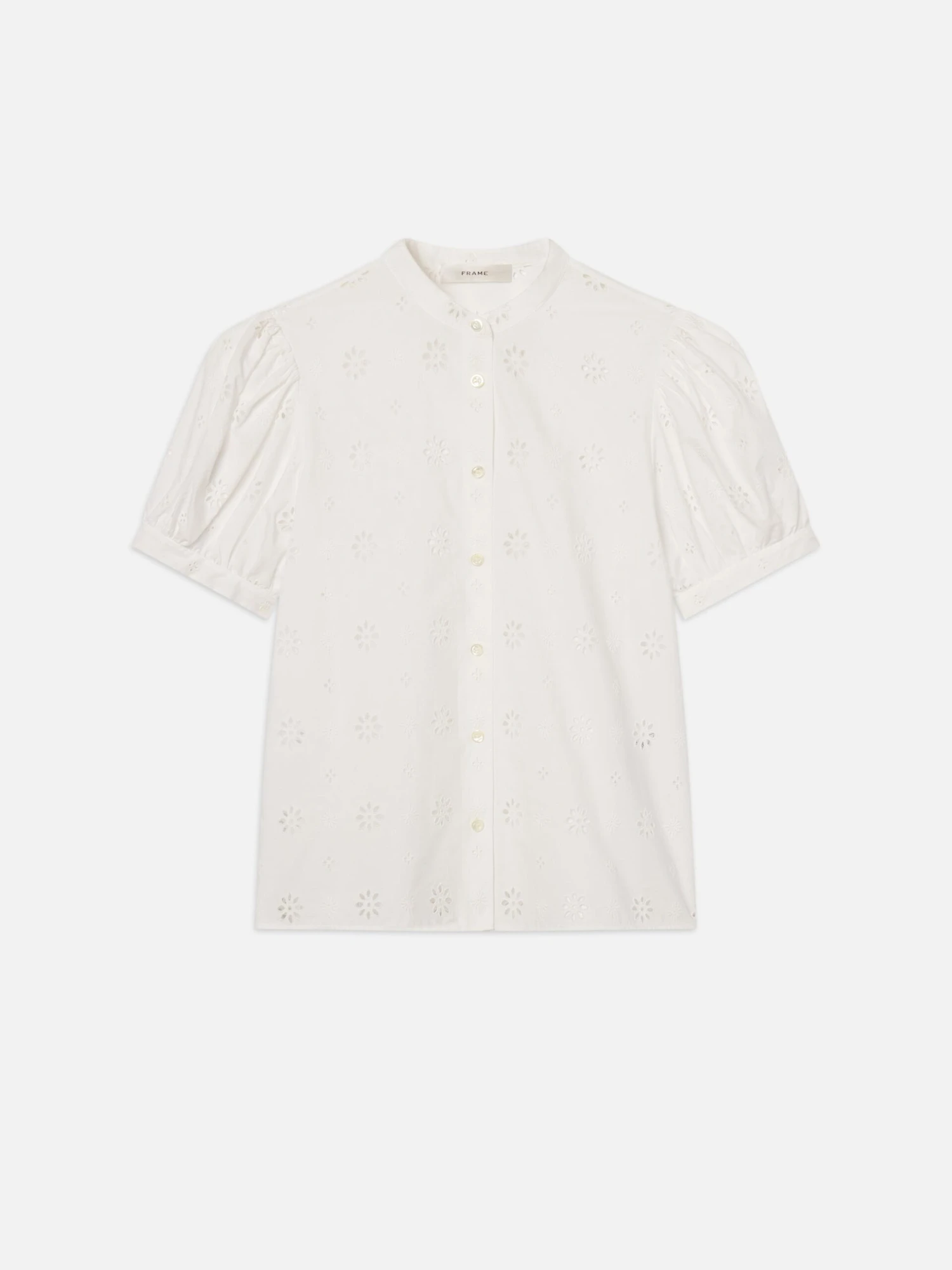 Eyelet is forever elegant. The artistic stitchwork covers a design that’s quintessentially FRAME, complete with puff sleeves enhanced by gathered detailing. Feminine, yet polished, the blouse also features a stand collar.