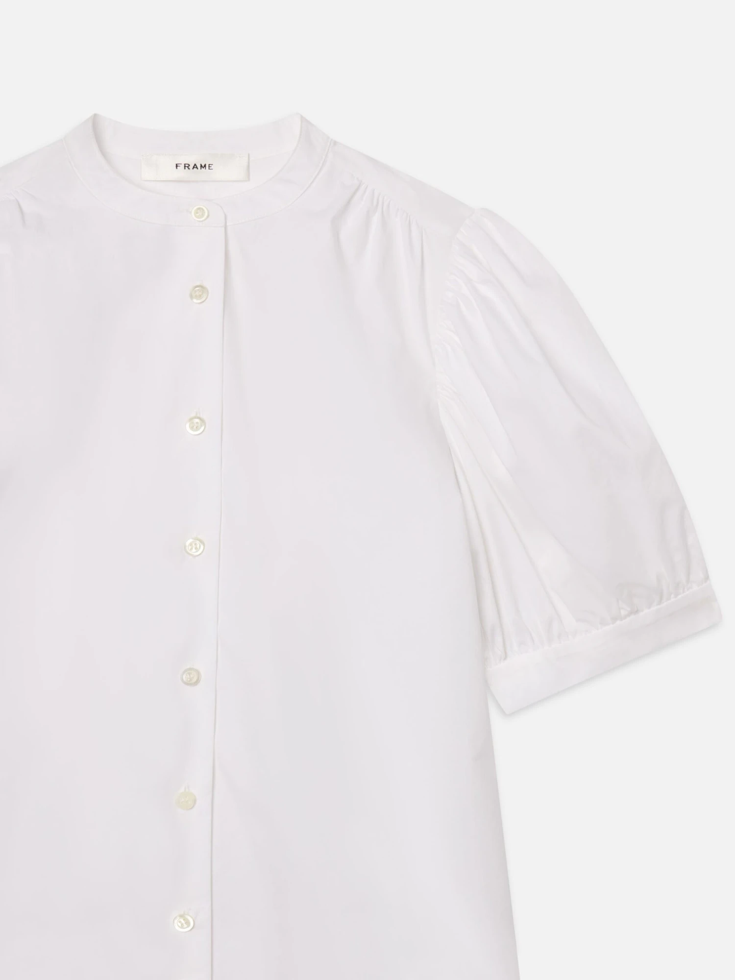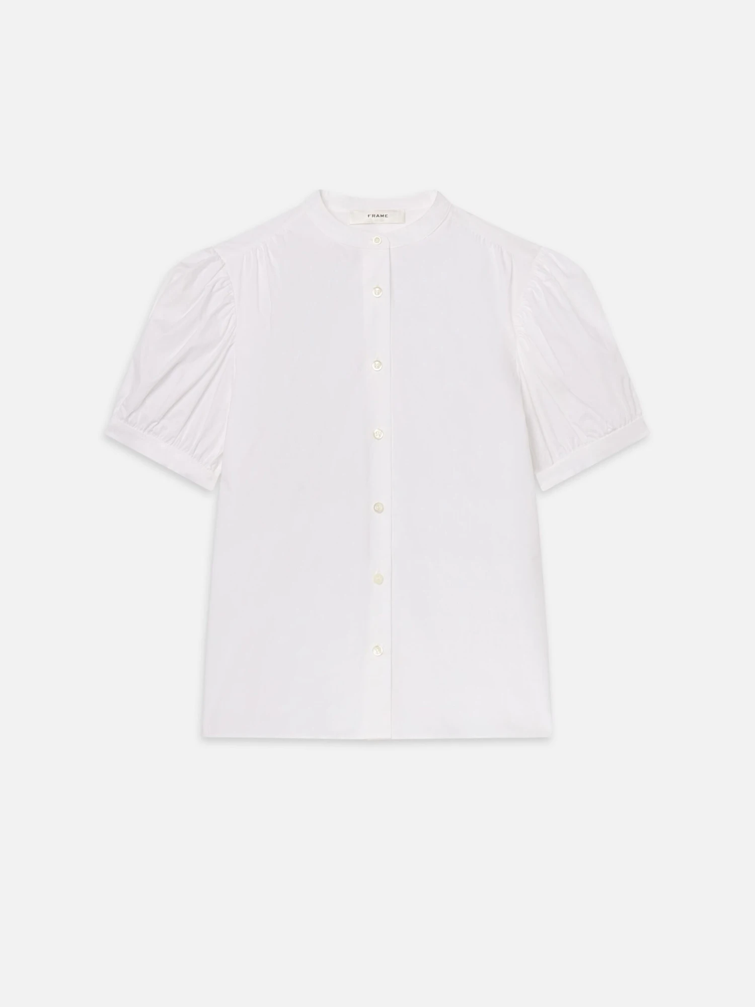 Quintessentially FRAME, The Gathered Top has puff sleeves enhanced by gathered detailing. Feminine, yet polished, the blouse also features a stand collar.