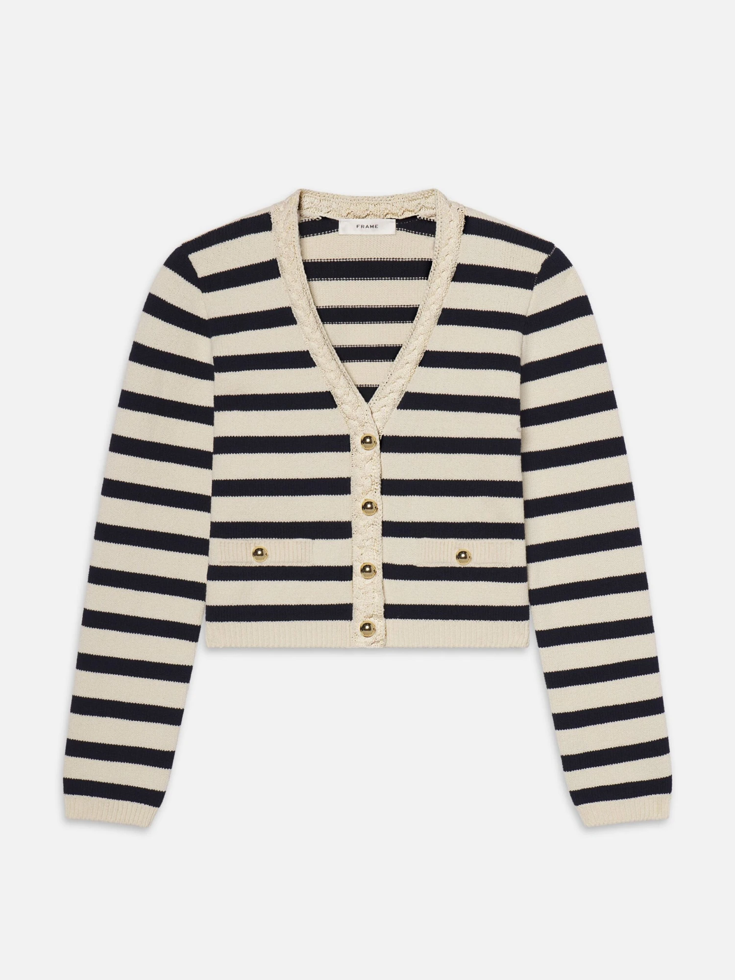 The Harbor Cardigan pairs braided trim and gold summarys with classic navy-and-cream stripes. Slightly cropped at the natural waist, this V-neck knit steers nautical in a new direction—anchored in tradition, finished with charm.
