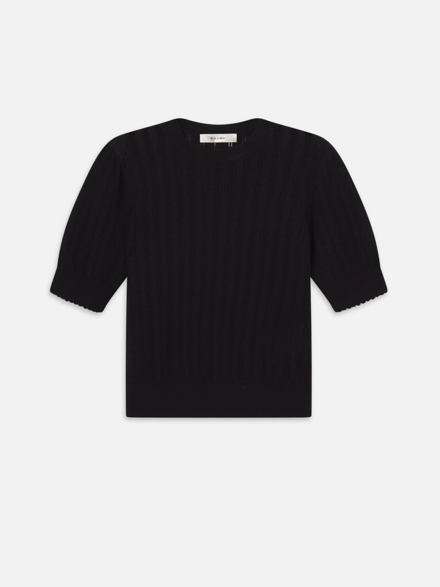 A lightweight cashmere knit with airy ladder pointelle stitching. With softly scalloped edges for an effortless, feminine feel.