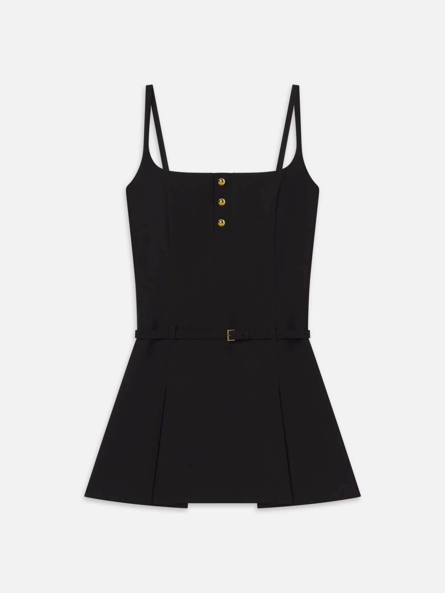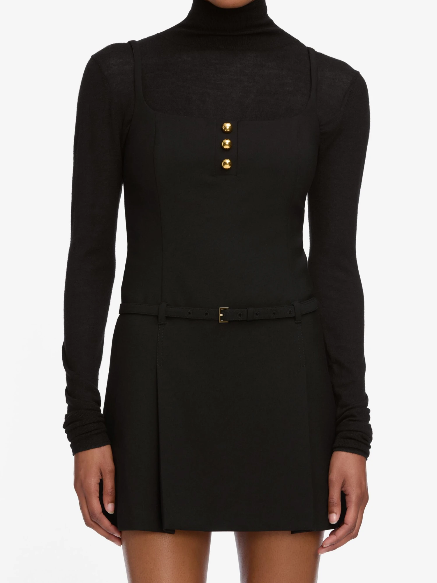 A uniform-inspired black pinafore with gold dome summarys, a self belt, and adjustable straps. Pleated skirt and princess seams add structure. Perfect over a slim turtleneck—expect compliments.