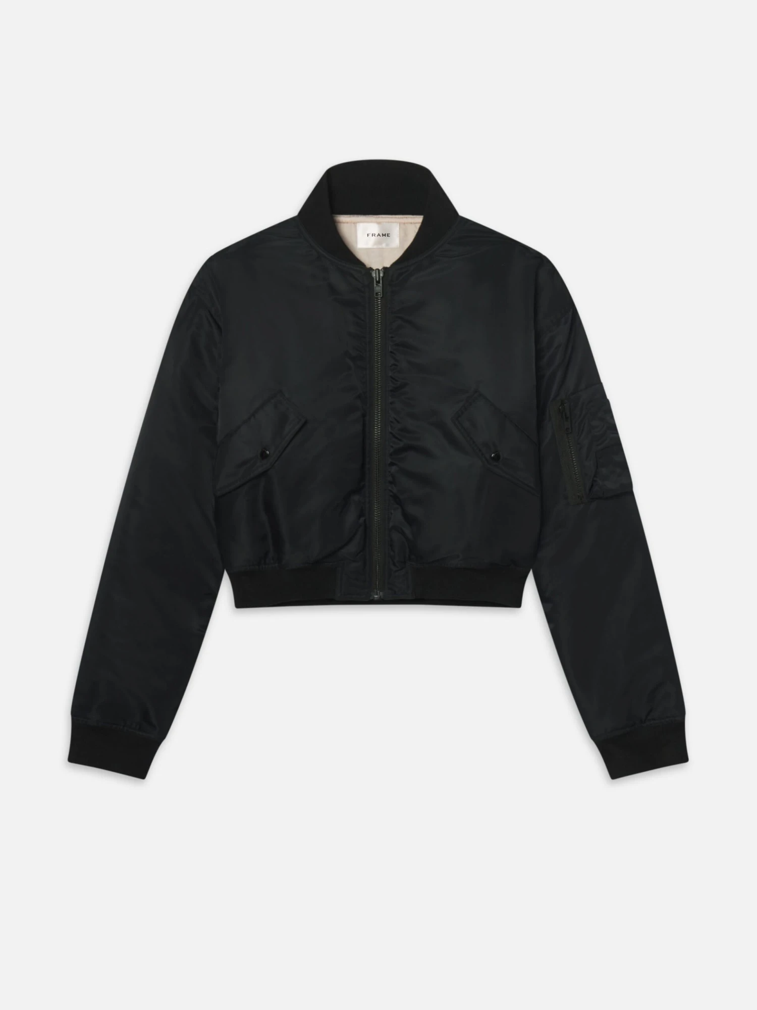 A modern take on the timeless bomber silhouette. This jacket has a slightly cropped fit, double front flap pocket and a zip pocket at the sleeve—finished with ribbed trim for a fitted waist, with contrast lining for quiet tonal depth.Â