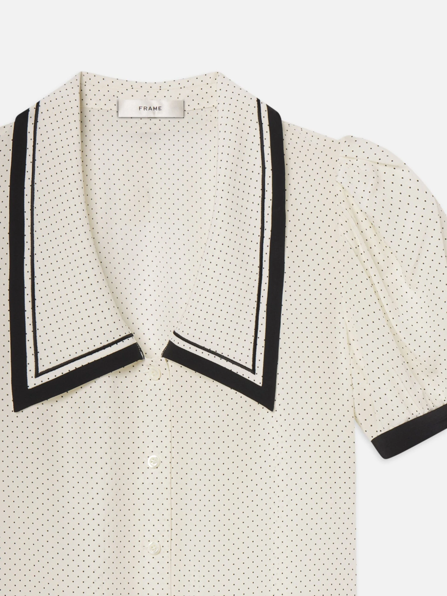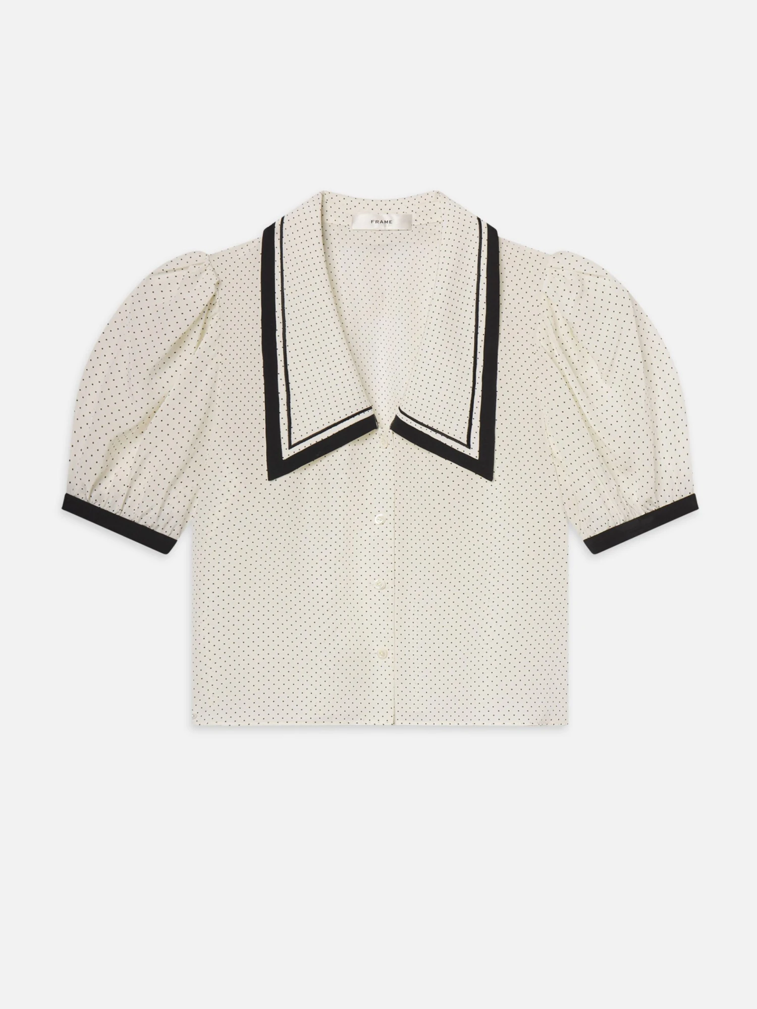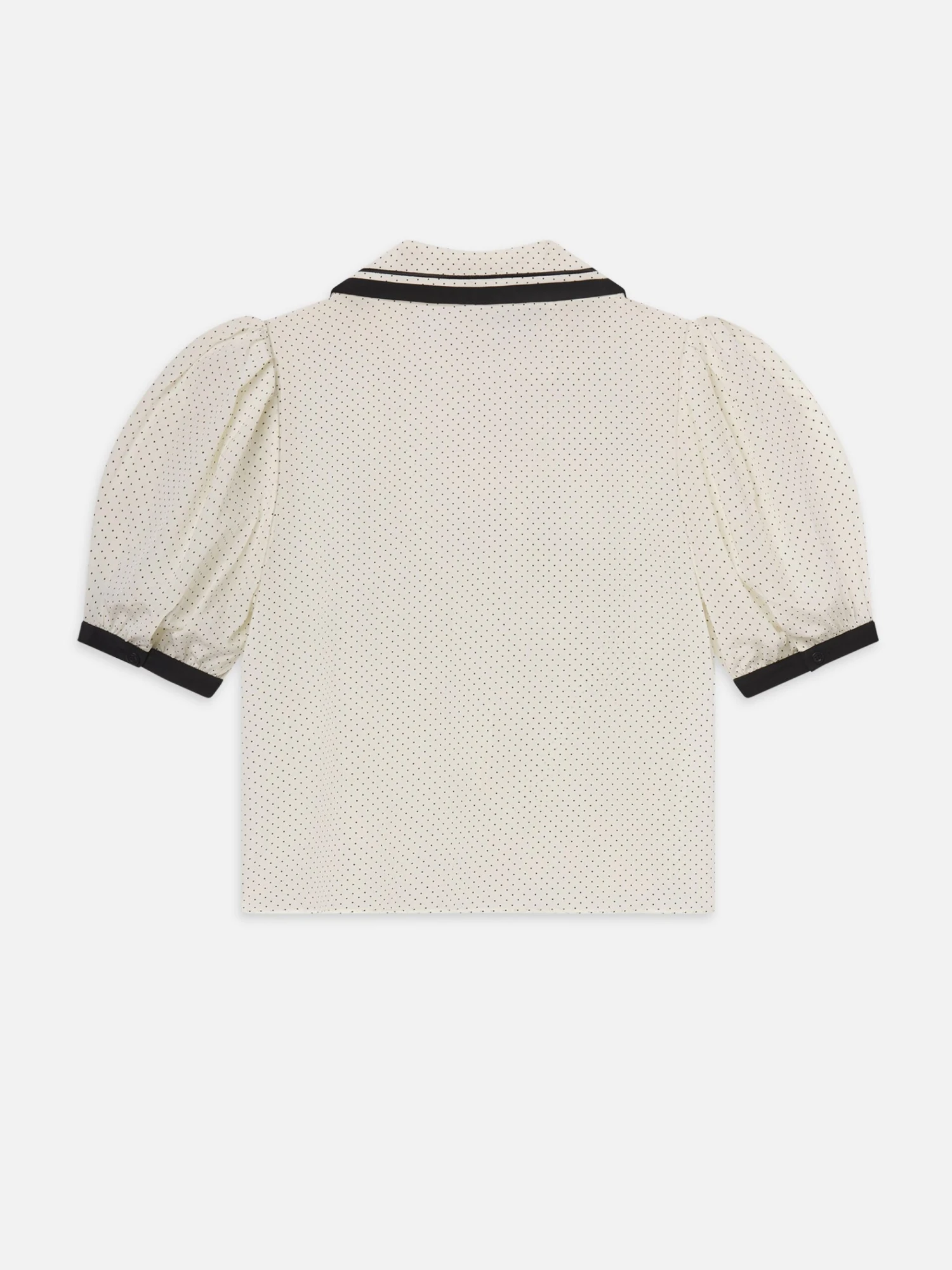 A short sleeve blouse crafted from 100% silk, done in white with tonal polka dots and an oversized collar that falls into an alluring V-neckline. Featuring feminine pleated sleeves for a romantic silhouette.