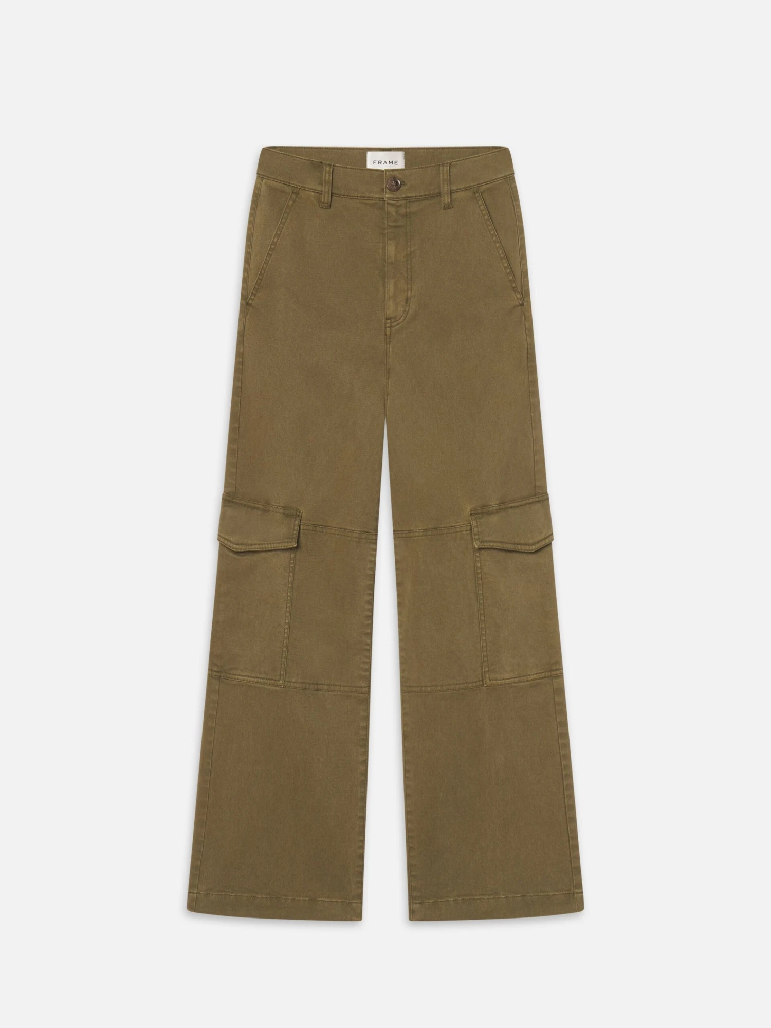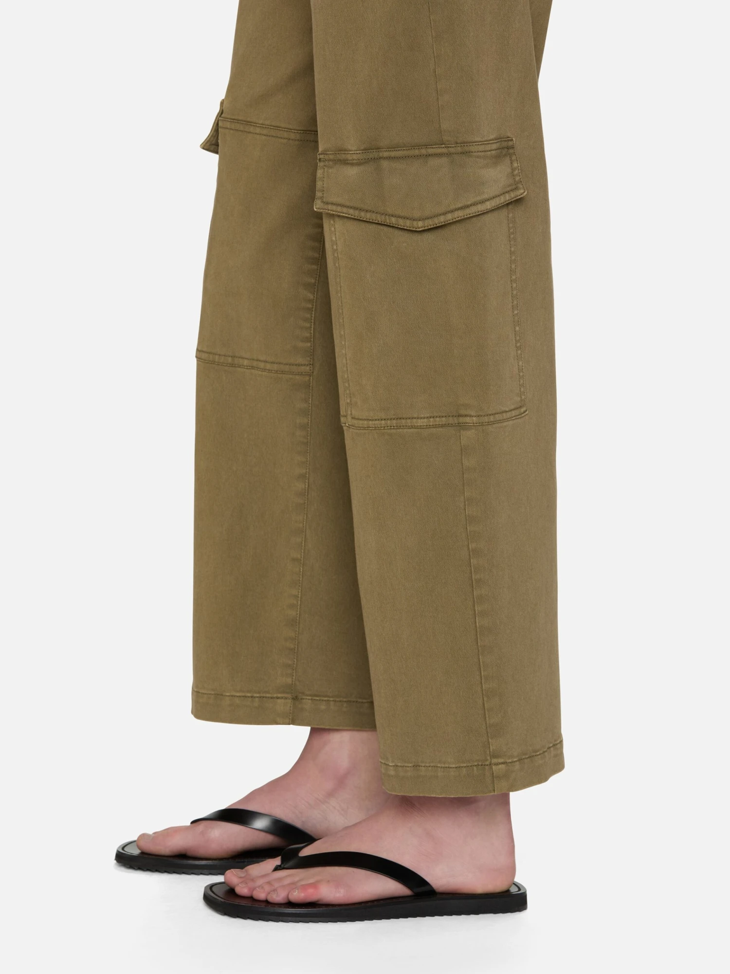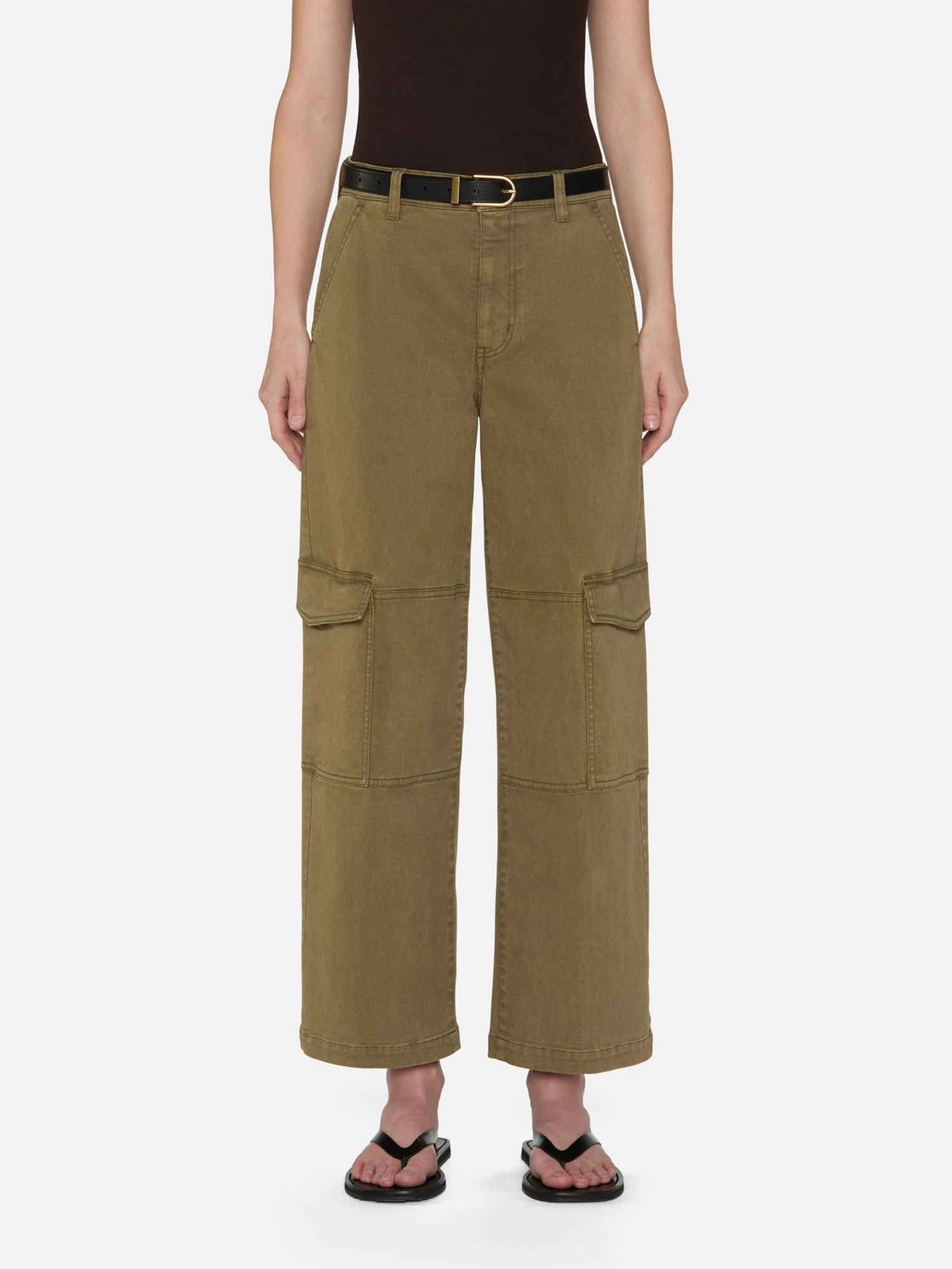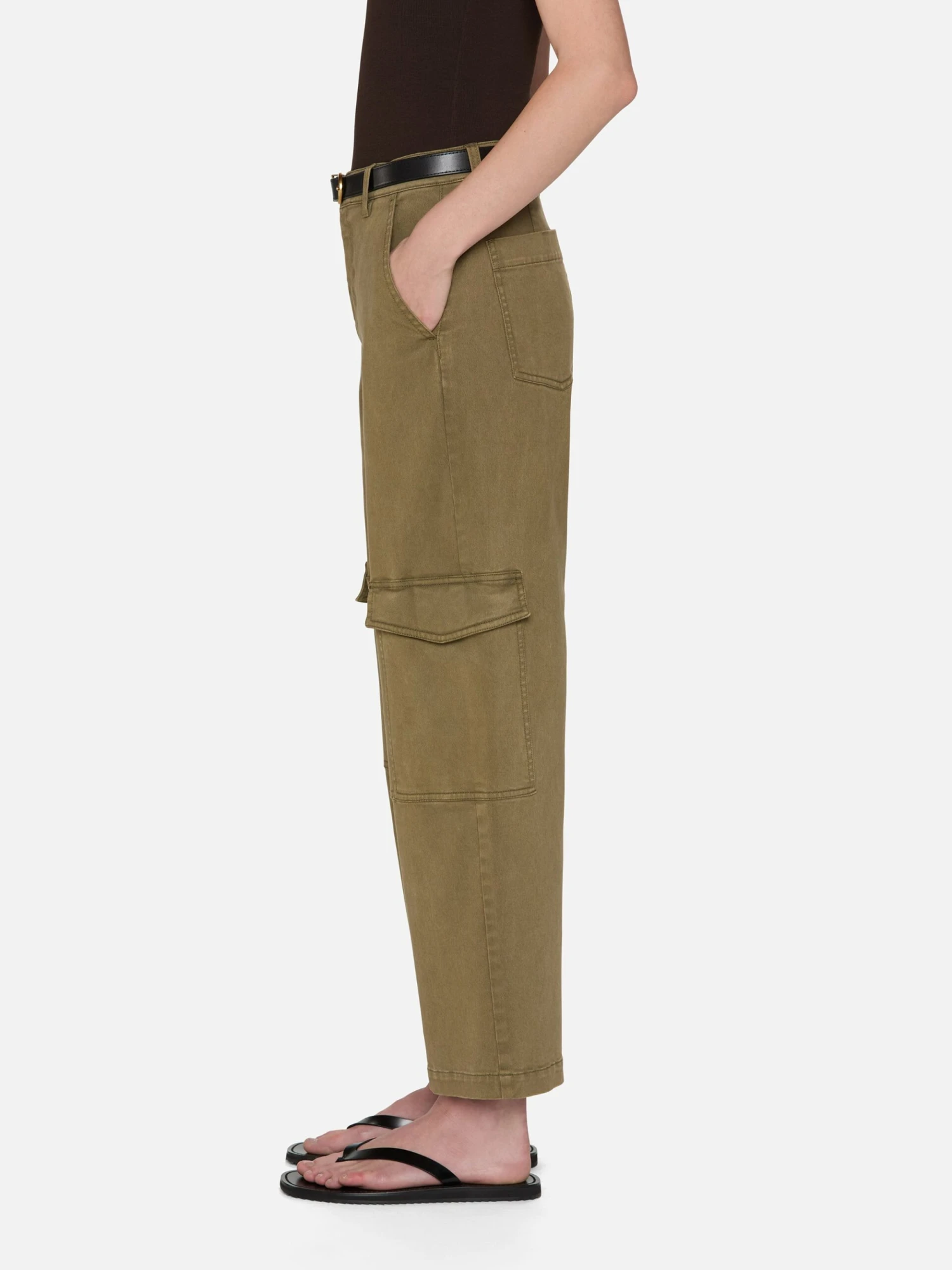 Step into utility style with an earthy green cargo pant. Crafted in stretch twill, the high-rise pair has a straight-falling fit with space through the leg and hits at the ankle. True to the style, the pant has cargo pockets on either side for a practical touch.