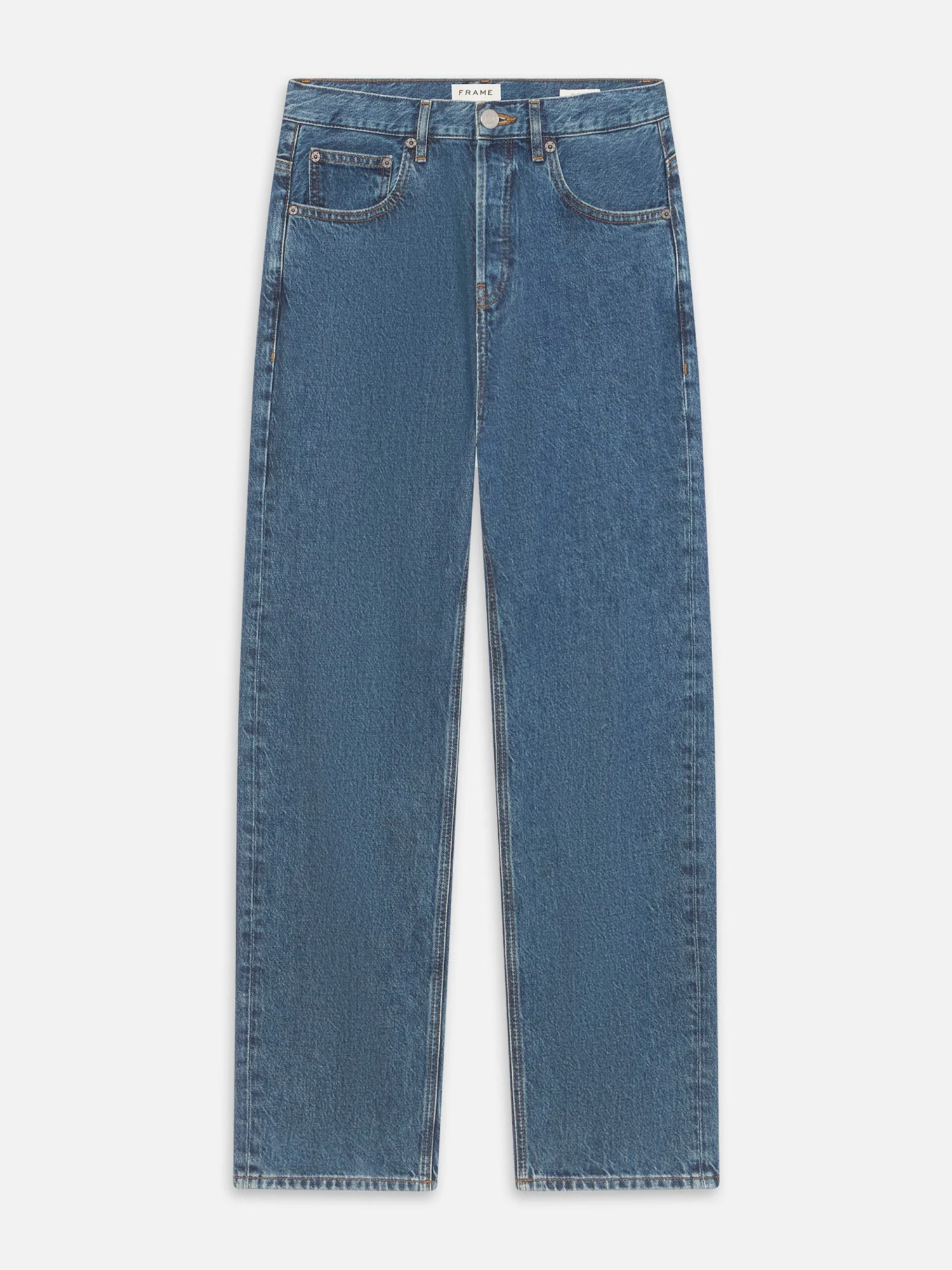 A FRAME favorite with a modern ethos. Designed with a mid-rise fit and clean, straight-leg silhouette, this summary-fly jean is crafted from premium 100% cotton for a classic rigid feel that wears in over time. Finished in a medium blue wash for a fresh look.