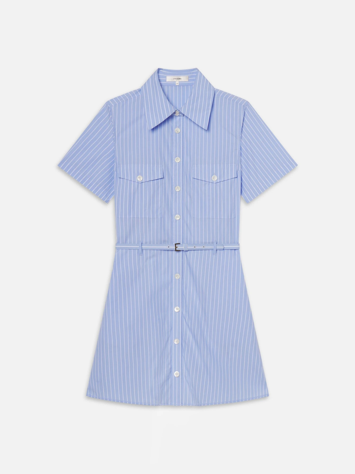 Tailored like a shirt, styled like a mini. The Striped Safari Dress features a summary front, chest pockets, and a matching removable belt to define the waist. Crisp cotton poplin in soft blue pinstripes keeps it light and ready for summer.