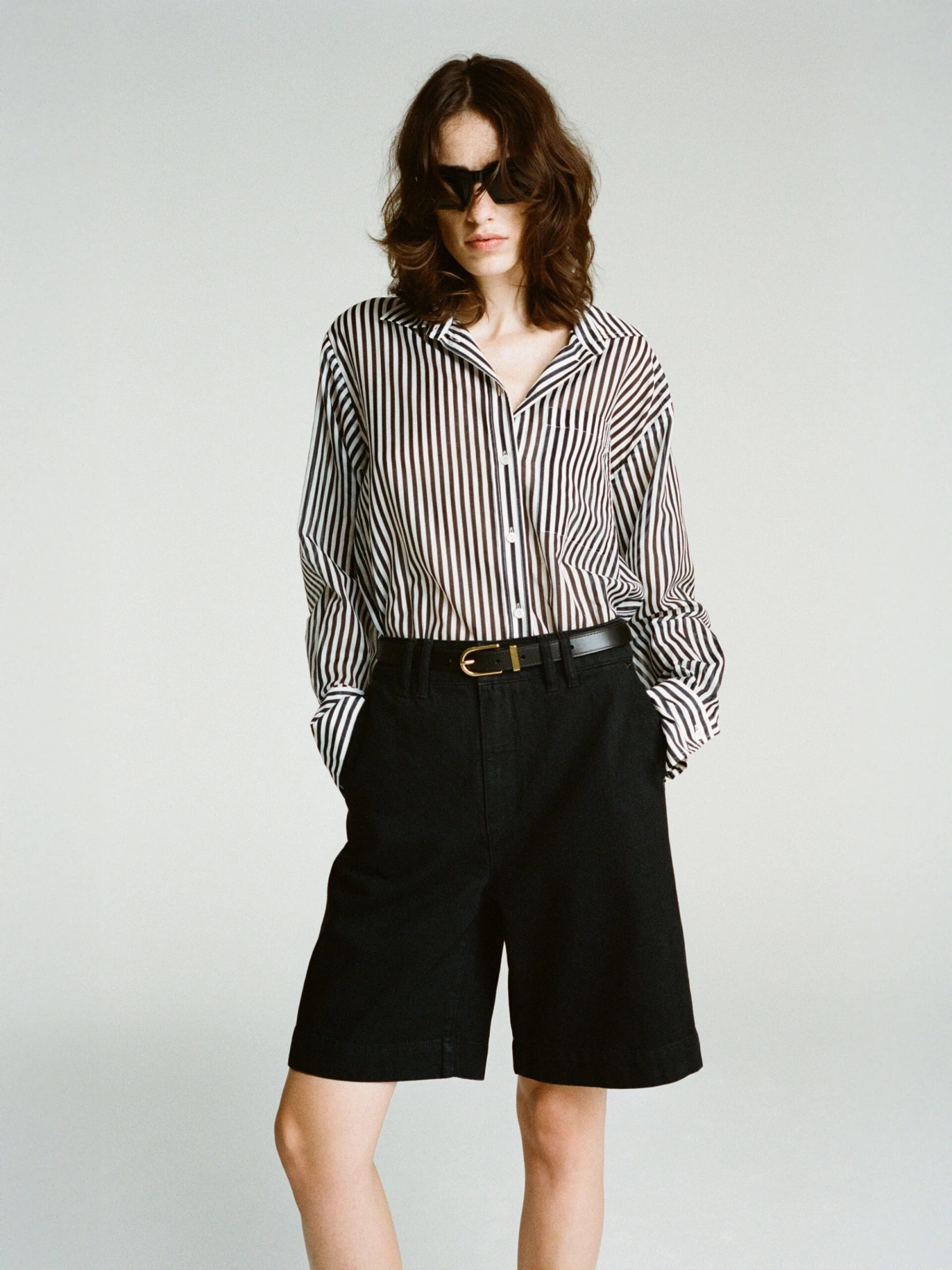 This tailored short features slant front pockets, a structured waistband, and a clean, above-the-knee length. Crafted from washed black denim, it nods to classic trousers—and wears like your favorite pair of jeans.