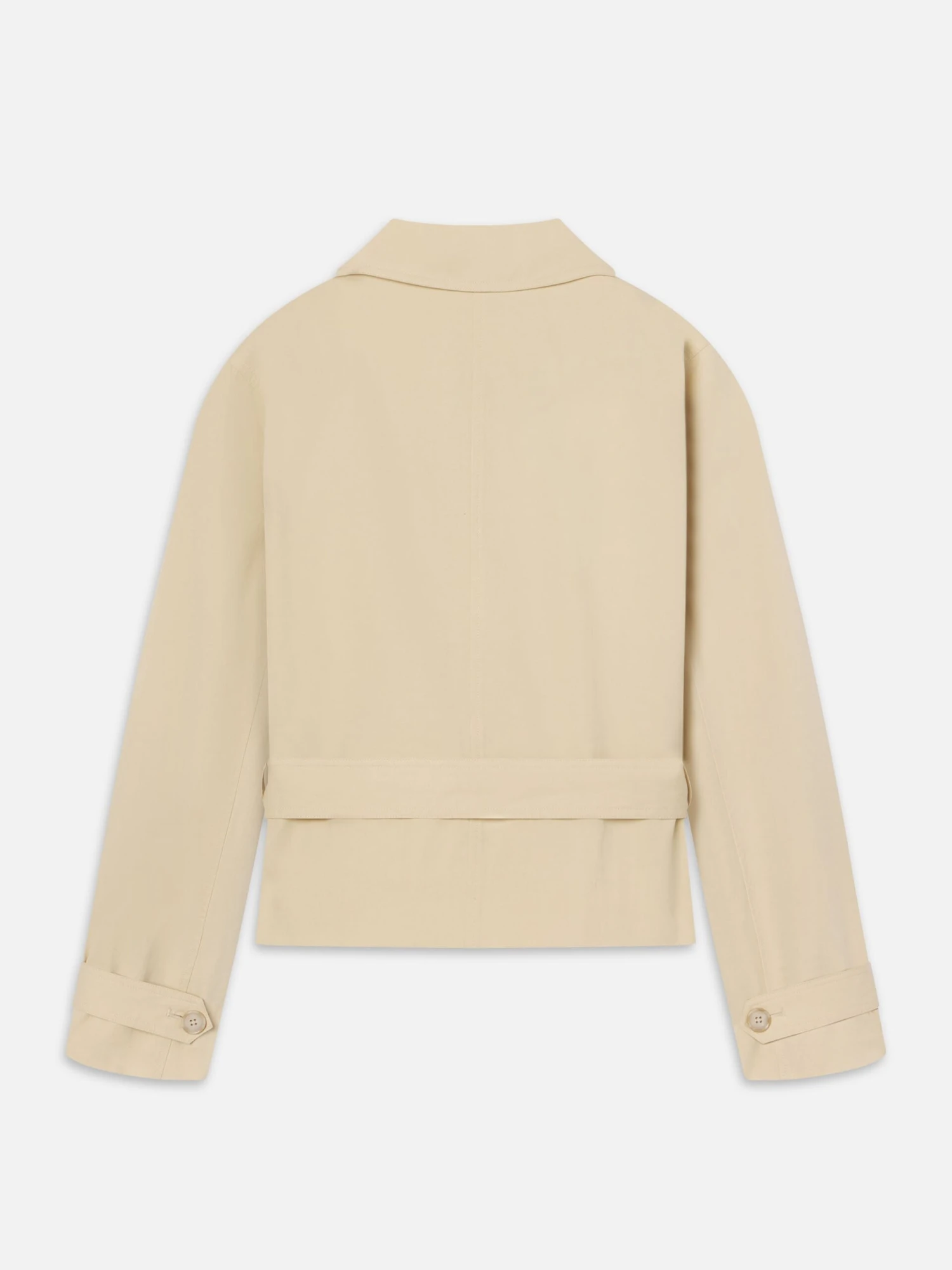 A cropped take on the classic—lightweight, tailored, and finished with a summary-and-belt closure. In soft oat, it’s the kind of layer that pulls you together in one clean move. Quietly polished, effortlessly thrown on.