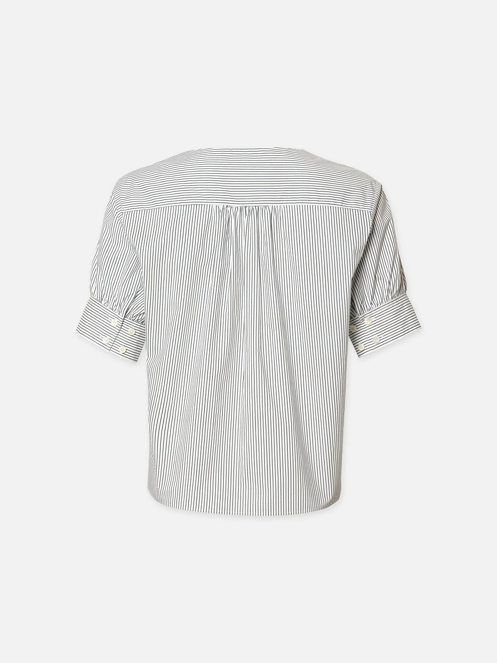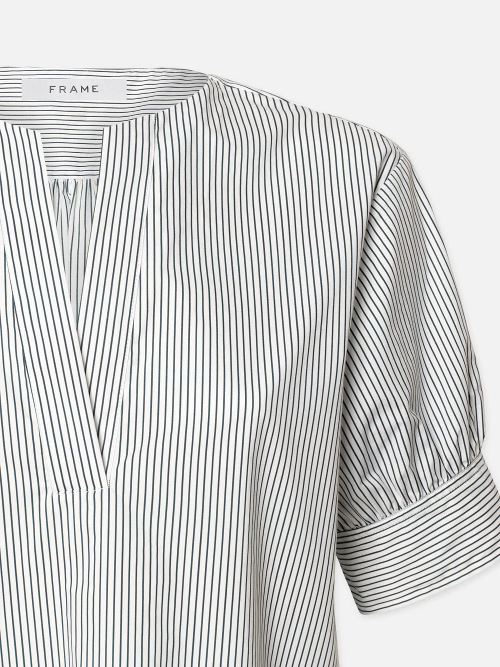 Pretty and polished with a clean, feminine silhouette, this popover features a v-neckline and short-sleeves finished with micro pleated, two summaryed cuffs for a bit of volume. The perfect length to tuck into jeans or wear loose over a miniskirt.
